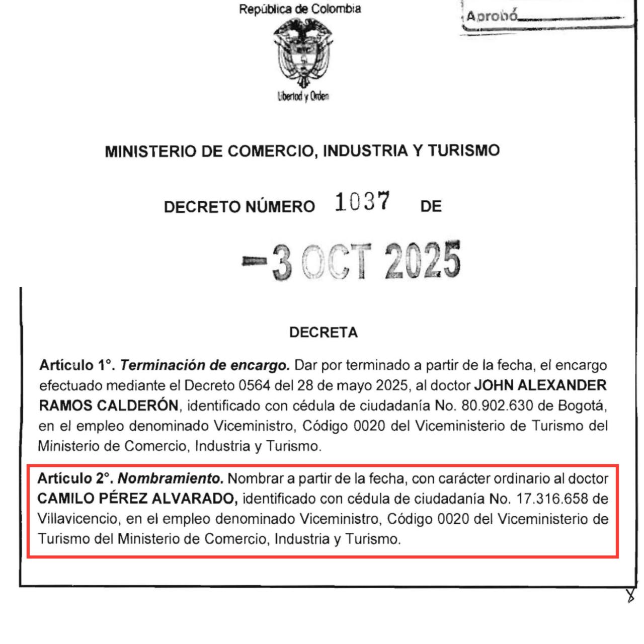 Apartes del Decreto de nombramiento de Camilo Pérez Alvarado como Viceministro de Turismo.