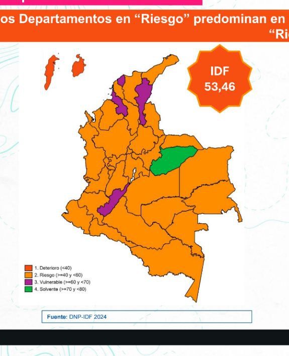 El informe también destaca avances en la recaudación de ingresos propios, que mejoró de 75,9 a 88,1 puntos, y en el cumplimiento de límites de gasto, que subió a 68,1 puntos. Sin embargo, 26 departamentos quedaron en la categoría de “riesgo”, y San Andrés y Providencia fue el único clasificado en “deterioro”.