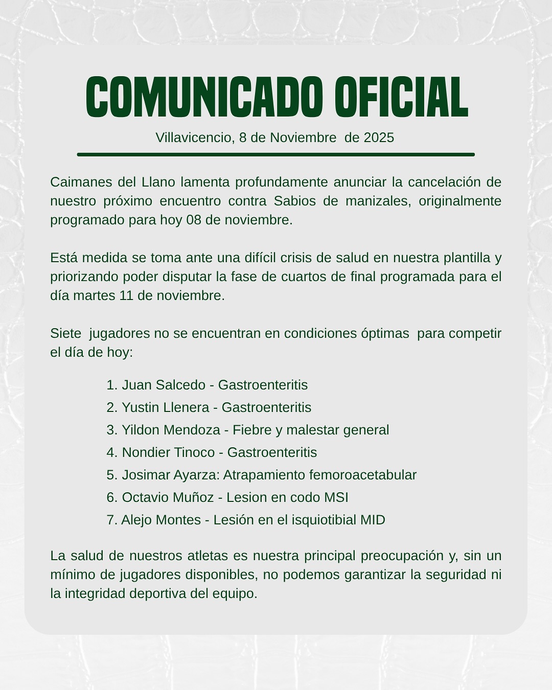 Villavicencio 10 de noviembre 2025.- Caimanes del Llano no se presentó a su último partido en Villavicencio contra Sabios de…