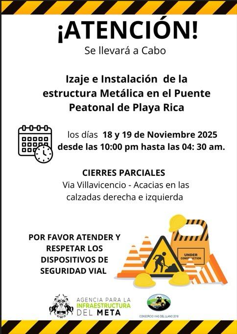Villavicencio, 18 nov 2025.- Para hacer el izaje e instalación de la estructura metálica en el puente peatonal del barrio Playa Rica, se harán cierres parciales en la vía hacia el municipio de Acacías, entre las 10:00 de esta noche de martes y las 4:30 de la madrugada del miércoles.