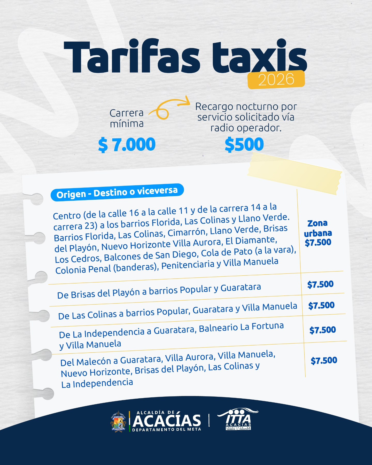 Villavicencio 2 de febrero 2026.- La Alcaldía de Acacías realizó el ajuste de las tarifas del servicio de transporte público para el municipio para taxis, buses y servicio automotor mixto.