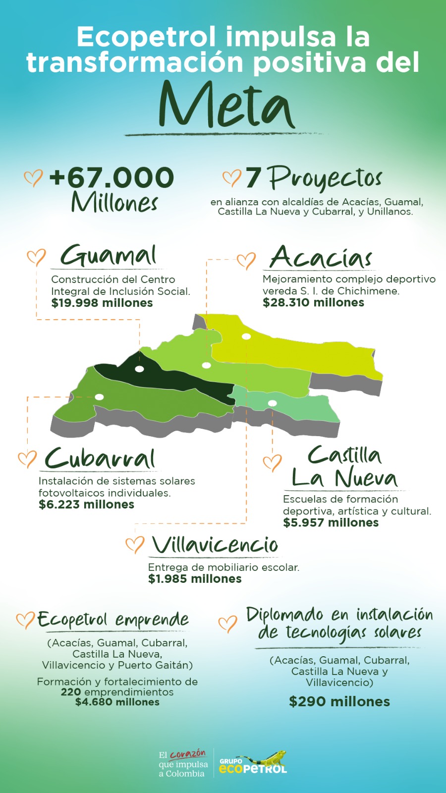En Castilla La Nueva, se implementará un programa de escuelas de formación deportiva, artística y cultural con una inversión de $5.957 millones, con aportes de Ecopetrol de $4.457 millones y de la Alcaldía municipal por $1.500 millones.