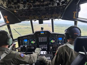Villavicencio, 10 sept 24.- Desde el Comando Aéreo de Transporte Militar – CATAM, despegó una aeronave C-130 Hércules hacia el Comando Aéreo de Combate No.2 en Villavicencio, Meta, con el propósito de fortalecer las capacidades para la extinción de incendios, desarrollando un ejercicio de entrenamiento con el sistema MAFFS II(Modular Airborne FireFigthing System).