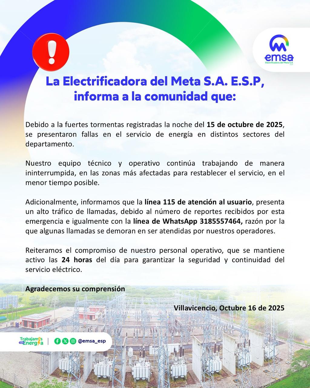 La Electrificadora del Meta (EMSA), se pronunció al respecto y dijo que su equipo técnico continúa operando para reestablecer el servicio eléctrico en toda la ciudad.