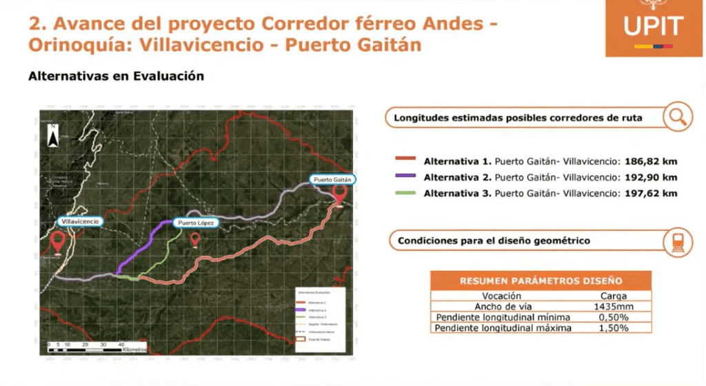 La iniciativa contempla el desarrollo de dos tramos: el primero entre Villavicencio y Puerto López, y el segundo desde Puerto López hasta Puerto Gaitán. En total, el corredor proyectado tendría una extensión aproximada de 193 kilómetros de vía férrea.